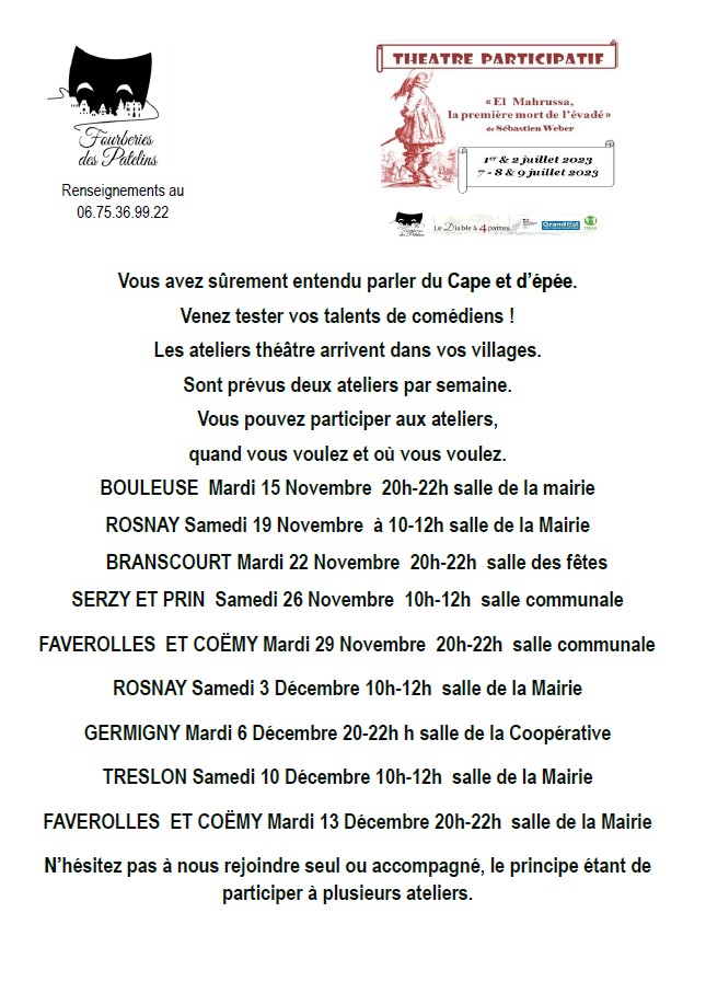 Théâtre participatif : dates des ateliers Publié le 28 octobre 2022 par Commune de Serzy et Prin Similaire