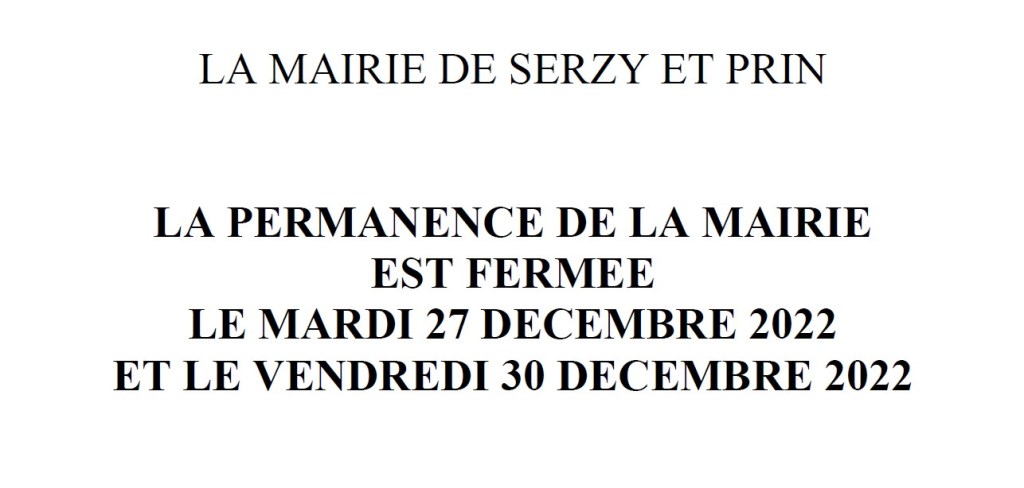 Fermeture du secrétariat de mairie pendant les fêtes Publié le 21 décembre 2022 par Commune de Serzy et Prin Similaire