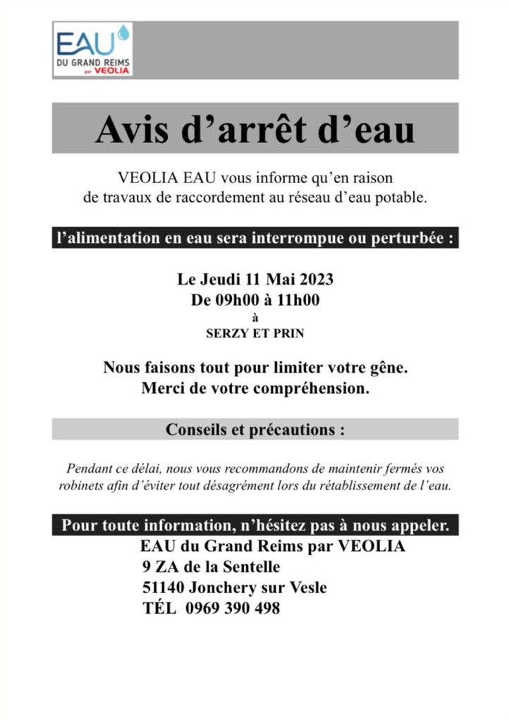 Coupure d’eau jeudi 11 mai de 9h00 à 11h00 Publié le 6 Mai 2023 par Commune de Serzy et Prin Similaire