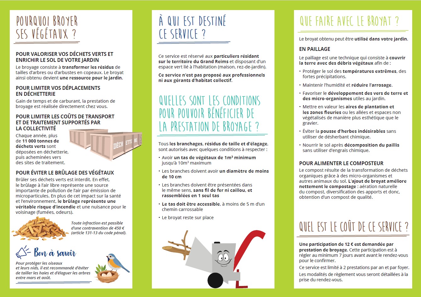 Service de broyage de végétaux à domicile Publié le 22 avril 2025 par Commune de Serzy et Prin Nouveau service proposé par le Grand Reims Si vous voulez télécharger la brochure explicative Similaire