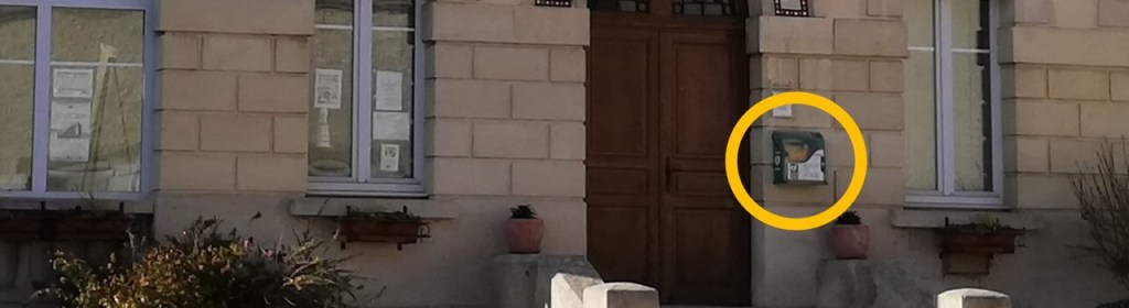 Un défibrillateur cardiaque est accroché au fronton de la mairie, en haut des marches, juste à droite de la porte principale…